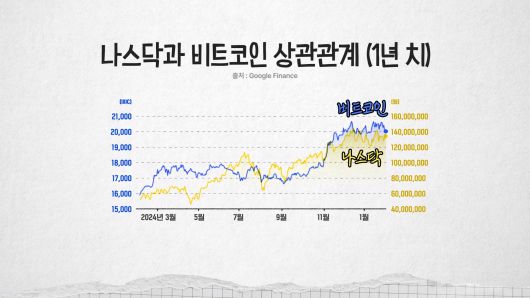 그러니까 '아, 이거 시장이 잘못 읽었다. 비트코인한테 굉장히 호재다' 하면서 관세 전쟁이 일어나면 일어날수록 호재다라고 보는 시각이 있죠. 그 부분은 어느 정도는 맞습니다. 왜냐하면 비트코인은 비상관 자산으로 주목을 받고 있어요. 비상관 자산이라고 하는 것은 주식이나 채권과는 다른 형태로 움직이는 거거든요. 그런데 비트코인도 최근 5년 동안은 나스닥하고 상관계수가 굉장히 높게 나왔어요.