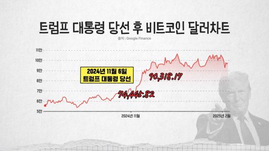 그래서 많은 사람이 지금 '야, 이거 트럼프 때문에 이렇게 많이 오르는 거 아니야?'라고 일반인들은 생각을 하는데 저희같이 이렇게 내부에서 이거를 계속 관찰하는 사람들은 '트럼프 효과 거의 안 보이는데?' 이렇게 보고 있어요. 트럼프 효과를 굳이 찾자면 트럼프 대통령이 11월 5일에 당선됐거든요. 그날 뭐 7만 달러를 뚫고 2~3주 만에 9만 달러까지 올라갔거든요.