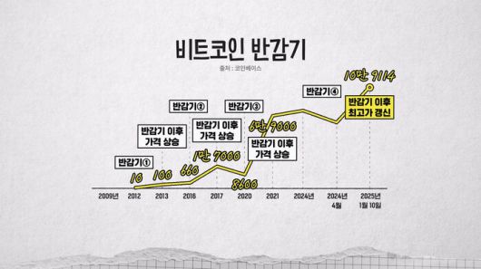 좀 더 설명하자면 비트코인 반감기라고 하면 비트코인은 하늘에서 뚝 떨어지는 게 아니라 채굴이라고 하는 시스템을 통해서 만들어지고 있거든요. 지금 이 순간에도 10분에 한 번씩 비트코인이 만들어지고 있습니다. 근데 처음에는 10분에 50개씩 채굴이 됐다가 4년 정도 지나서 25개, 그러다가 4년 정도 지나서 12.5개, 그리고 4년 정도 지나서 6.25개, 그리고 지금 3.125개로 작년 4월부터 반감이 됐거든요. 근데 이 반감기 때마다 첫 번째 반감기 때는 기준 반감기 전에 평균 가격 대비 100배가 올랐어요. 100배를 유지한 건 아니고 이제 꺼졌죠.