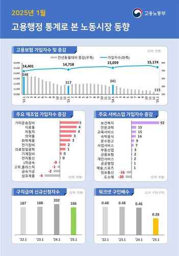 고용보험 가입자는 2023년 1월 31만7천명, 2024년 1월 34만1천명이 증가한 바 있다.