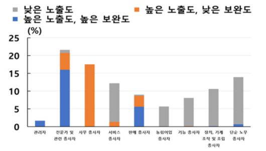 직업별로 살펴보면 관리자와 전문가 및 관련종사자는 AI 이용이 많을 수 있지만, 업무를보완하기 위해 활용하는 경우가 많아 '높은 노출도 높은 보완도' 그룹에 속하는 것으로 나타났다. 반면 사무종사자는 AI의 이용만으로 업무를 완료할 수 있어 '높은 노출도 낮은 보완도' 그룹에 속했다.