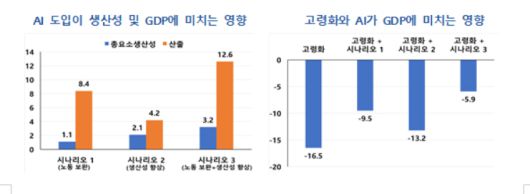 일자리에 AI가 최대치로 도입될 경우(시나리오 3) 생산성은 3.2%, GDP는 4.2~12.6%로 높아진다. 고령화와 노동공급 감소로 인한 성장 둔화를 상당부분 상쇄할 수 있다는 설명이다.