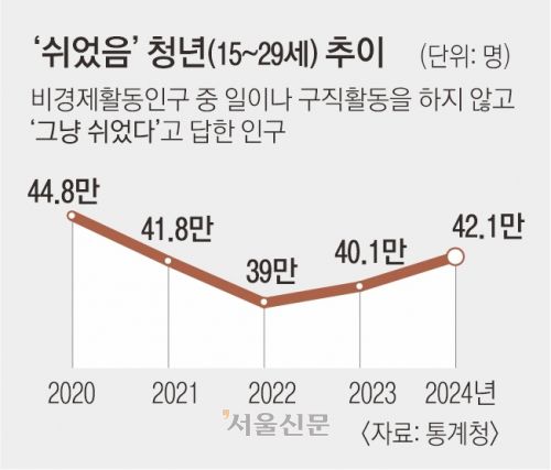 지난해 ‘쉬었음’ 청년(15~29세)은 42만 1000명으로, 집계를 시작한 2003년 이후 역대 두번째로 많았다. ‘쉬었음’은 중대한 질병이나 장애가 없음에도 경제활동인구 조사에서 “그냥 쉰다”고 답한 이들이다. 양질의 일자리가 부족한 미스매치 탓에 청년들이 노동시장을 떠나고 있다는 의미다.