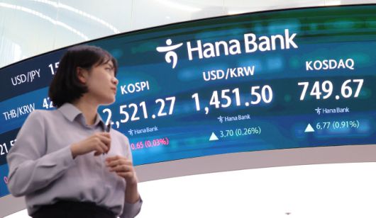 10일 오후 서울 중구 하나은행 본점 딜링룸 화면에 코스피와 코스닥 지수. 원·달러 환율이 표시돼 있다. (사진=연합뉴스) |