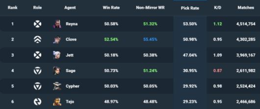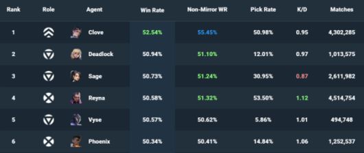 하지만 메타가 바뀌며 킬조이와 사이퍼와 다른 바이스만의 장점 덕분에 픽률이 크게 상승했다. 바이스 출시 당시에는 승률은 49.4%로 하위권에 머물렀다. 하지만 10.00 패치 기준 승률 50.57%까지 최상위권으로 상승했다.