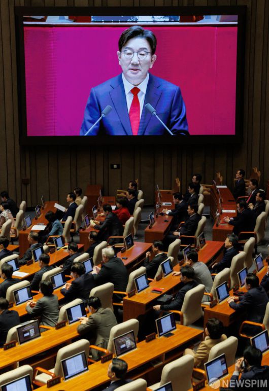 [서울=뉴스핌] 윤창빈 기자 = 권성동 국민의힘 원내대표가 11일 오전 서울 여의도 국회에서 열린 본회의에서 교섭단체 대표연설을 하고 있다. 2025.02.11 pangbin@newspim.com