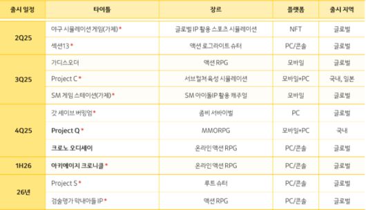 PC 및 콘솔 게임으로 오픈월드 온라인 액션 RPG 크로노 오디세이, 액션 로그라이트 슈터 '섹션13' 등 여러 글로벌 작품을 연내 선보일 예정이다. 모바일 게임으로는 트리플A급 '프로젝트 Q'를 비롯해 2D 도트 그래픽의 횡스크롤 액션 RPG '가디스 오더', 서브컬처 육성 시뮬레이션 '프로젝트 C' 등이 예고됐다.