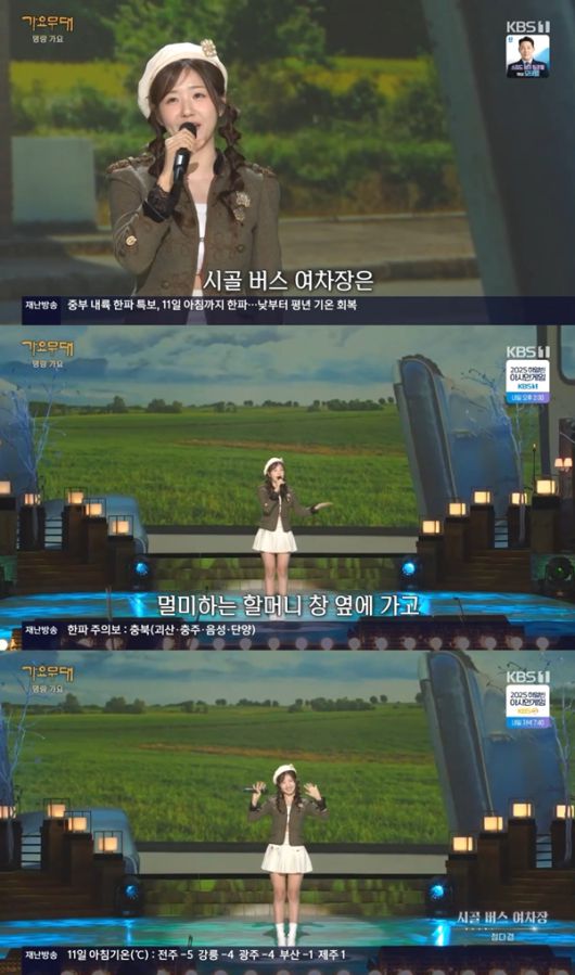정다경은 지난 10일 방송된 KBS1 '가요무대'에 출연했다. 명랑 가요를 주제로 이날 방송에서 정다경은 레트로한 감성의 의상을 매치해 친숙하면서도 사랑스러운 매력을 뽐내며 심연옥의 '시골버스 여차장'을 열창했다.