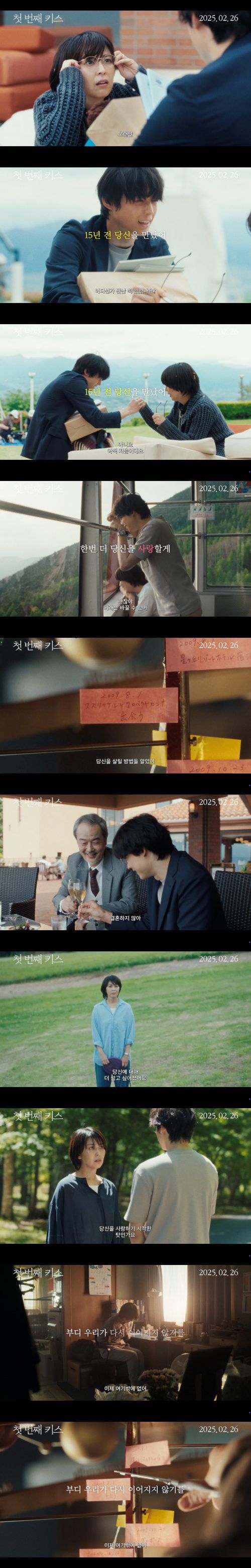 영화 '첫 번째 키스'(감독 츠카하라 아유코, 각본 사카모토 유지, 수입 ㈜미디어캐슬, 배급 메가박스중앙(주))는 이혼 위기에 남편 카케루(마츠무라 호쿠토)를 사고로 잃게 된 칸나(마츠 타카코)가 우연히 15년 전의 그와 다시 만나게 된 후 펼쳐지는 이야기.