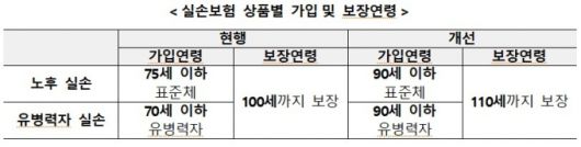 아울러 유병자가 가입 가능한 실손보험의 가입 연령도 현행 75세에서 90세로 확대하고, 보장연령도 현행 100세에서 110세로 늘어난다. 이 보험은 가입심사 항목이 6개로 일반 실손의 18개 대비 축소된 상품으로 경증 만성 질환이나 치료 이력이 있지만 일정 기간이 지난 유병력자를 대상으로 한다. 현재 생보사 2개, 손보사 11개사가 판매하고 있다.