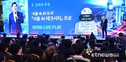 AI서울 2025가 'AI로 만드는 조화로운 사회'를 주제로 11일 서울 강남구 코엑스에서 열렸다. 오세훈 서울시장이 '글로벌 AI 혁신 선도 도시, 서울'을 주제로 기조발표를 하고 있다. 이동근기자 foto@etnews.com [Copyright © 전자신문. 무단전재-재배포금지]