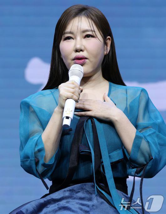 가수 송가인이 11일 서울 강서구 스카이아트홀에서 가진 정규 4집 '가인;달' 발매 쇼케이스에서 취재진 질문에 답하고 있다. 2025.2.11/뉴스1 ⓒ News1 권현진 기자 |