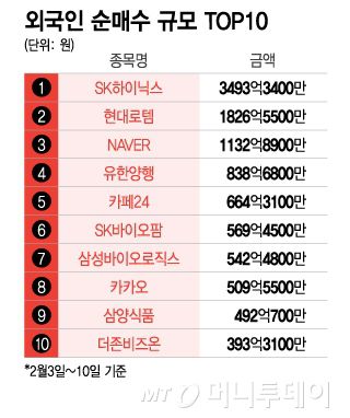 전날 기준 외국인 순매수 규모에 유한양행(4위·2840억원), SK바이오팜(6위·570억원), 삼성바이오로직스(7위·540억원) 등 바이오주가 다수 포진한 것으로 나타났다.