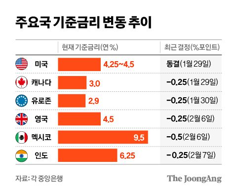 6일 영국 중앙은행은 기준금리를 0.25%포인트, 멕시코는 0.5%포인트 내렸다. 유럽연합(EU)과 캐나다 역시 지난달 29일 기준금리를 각각 0.25%포인트 인하했다. 유럽중앙은행(ECB)은 지난해 9·10·12월 세 차례 회의에서 모두 금리를 내린 데 이어 지난달까지 정책금리를 하향 조정하면서 4회 연속으로 인하했다.