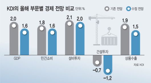 KDI가 이번에 경제 성장률 전망치를 1.6%(상반기 0.9%·하반기 2.2%)로 대폭 낮춘 것은 내수부진에 더해 미국 신정부의 정책 변화로 글로벌 통상환경이 급변하면서 우리 수출에 악영향을 미칠 것이라는 우려를 반영해서다.