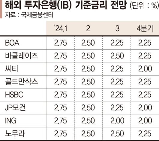 해외 투자은행(IB)들이 한국은행 금융통화위원회가 올해 상반기 기준금리를 연 3.00%에서 연 2.50%로 내릴 것으로 내다봤다. 8곳의 IB 모두가 올해 1·4분기와 2·4분기에 각 0.25%p씩 금리를 인하할 것이라고 전망했다.