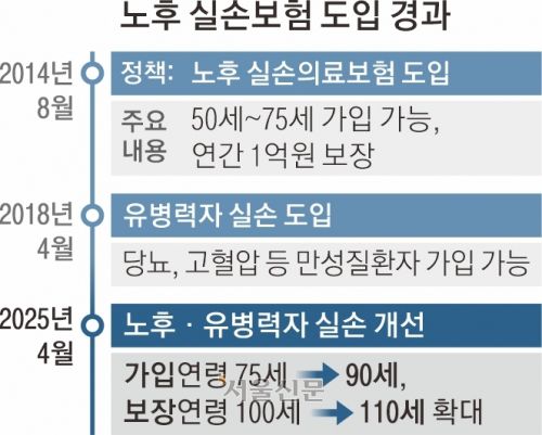 노후 실손의료보험은 2014년 8월에 도입됐다. 50세에서 75세 사이의 고령층을 대상으로 시작됐다. 일반 실손에 비해 70~80% 수준의 보험료로 출시됐다. 이후 노후 실손은 고령층 의료비 부담을 낮추는 유효한 수단으로 자리잡았다는 평가를 받았다. 하지만 가입 심사 항목이 일반 실손과 동일해 만성질환자나 치료 이력이 있는 고령층의 가입에는 한계가 있었다.