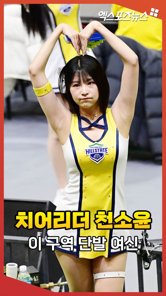 (엑스포츠뉴스 수원, 박지영 기자) 11일 오후 경기도 수원실내체육관에서 열린 '도드람 2024-2025 V리그' 현대건설과 한국도로공사의 경기, 현대건설 천소윤 치어리더가 열띤 응원을 펼치고 있다. 박지영 기자 jypark@xportsnews.com