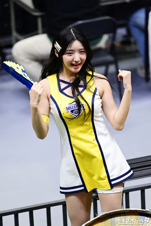 (엑스포츠뉴스 수원, 박지영 기자) 11일 오후 경기도 수원실내체육관에서 열린 '도드람 2024-2025 V리그' 현대건설과 한국도로공사의 경기, 현대건설 고가빈 치어리더가 응원을 펼치고 있다.박지영 기자 jypark@xportsnews.com