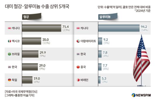 미국 국제무역청(ITA)에 따르면 지난해 대미 철강 수출 상위 5개국은 캐나다, 멕시코, 브라질, 한국, 독일 순이다. 우리나라는 29억달러를 수출했다. 대미 알루미늄 수출 상위 5개국은 캐나다, 아랍에미리트(UAE), 한국, 중국, 바레인 순이다. 우리나라의 수출액은 7억8000만달러다.