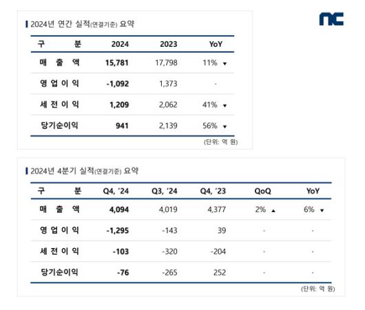 엔씨소프트의 2024년 연간 실적은 매출 1조 5781억 원, 영업손실 1092억 원, 당기순이익 941억 원을 기록했다.
