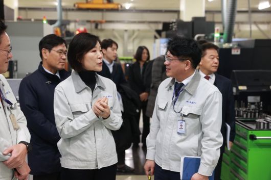 오영주(왼쪽) 중소벤처기업부 장관이 지난해 미국 수출 중소기업을 찾아 생산 현장을 둘러보고 있다. [중소벤처기업부 제공] |