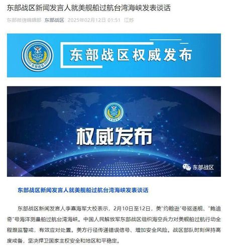 12일 로이터통신과 중국중앙TV(CCTV)에 따르면 중국군 동부전구 대변인인 리시 해군 대령은 이날 공식 소셜미디어(SNS) 위챗 계정을 통해 "10일부터 12일까지 미 해군 구축함 존슨호와 해양측량선 바우디치호가 대만해협을 통과했다"고 밝혔다.