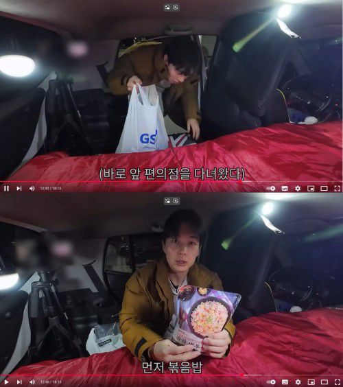 잡재홍은 지난달 10일 '[영하 11도] 한국에서 가장 저렴한 차로 살아남기'라는 영상을 업로드했다. 해당 영상에서 그는 모닝 차량에서 배가 고파 편의점에 다녀왔다며 '곰곰새우볶음밥'을 꺼냈다.