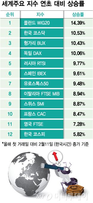 캐나다 멕시코 다음으로 관세 부과 대상을 지목되는 유럽도 연초 대비 높은 상승률을 보였다. 전날 기준 세계 주가 상승률을 비교해보면 1~10위 중 9개가 유럽 지수인 것으로 나타났다. 상승률 2위를 기록한 코스닥(10.53%)을 제외하면 폴란드 WIG20(14.39%), 독일 DAX(10.06%), 프랑스 CAC(8.47%) 등이 대거 높은 증가율을 보였다.