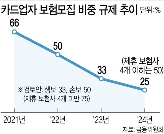 카드사에 카드슈랑스는 수익성이 좋은 서비스였다. 그러나 금융당국이 판매 비중을 지난 2021년 66%로 제한한 이후 2023년 25%까지 하락하며 매출에 이바지하지 못하는 수준까지 떨어졌다. ‘25%룰’은 원래 방카슈랑스(은행의 보험상품 판매)에서 착안한 규제로 다양한 보험사들의 상품 판매 경쟁을 위해 촉발했다.