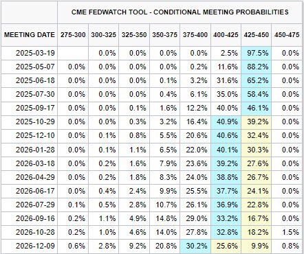 이런 상황에서 연준이 금리를 보다 오랫동안 동결할 가능성이 커졌다. 시카고상품거래소(CME) 페드워치에 따르면, 연방기금금리(FFR) 선물시장은 올해 운이 좋아야 단 한차례 금리인하만 가능할 것으로 보고 있다. 오는 3월 금리 동결 가능성을 97.5%로 가격에 반영했다. 전장보다 2.5%포인트 높아졌고, 10월 금리가 25bp 이상 내려갈 확률은 61.8%다.