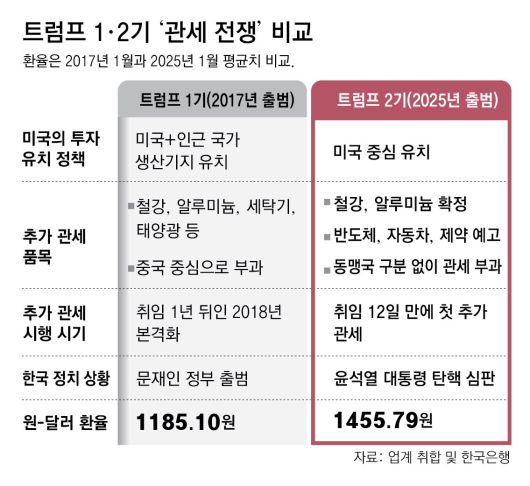 트럼프 1기 때는 관세 전쟁의 전선(戰線)이 철강, 알루미늄, 자동차 등에 국한됐다. 하지만 이번에는 반도체와 바이오에 관세를 부과할 수 있다는 발표가 나왔다. 모두 한국 기업들이 잘하는 사업이다. 반도체 업계 관계자는 “통상 관세를 매기지 않는 반도체까지 걸고 넘어진 것이 의외”라며 “숙련공 수급이나 인건비를 고려하면 미국이 반도체 공장을 짓기 좋은 입지가 아니라서 고심”이라고 말했다.