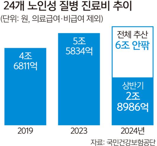 지난해 치매 등 노인성 질병 진료비가 6조원에 이를 것으로 추정된다. 이는 5년 새 30% 가까이 증가한 것이다. 초고령화로 건강보험과 의료급여를 적용받는 65세 이상 인구는 지난해 상반기 기준 1000만명을 넘어선 상태다.