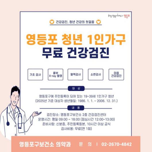 영등포구 보건소가 지역 내 1인가구 청년을 대상으로 무료 건강검진을 실시한다고 밝혔다.