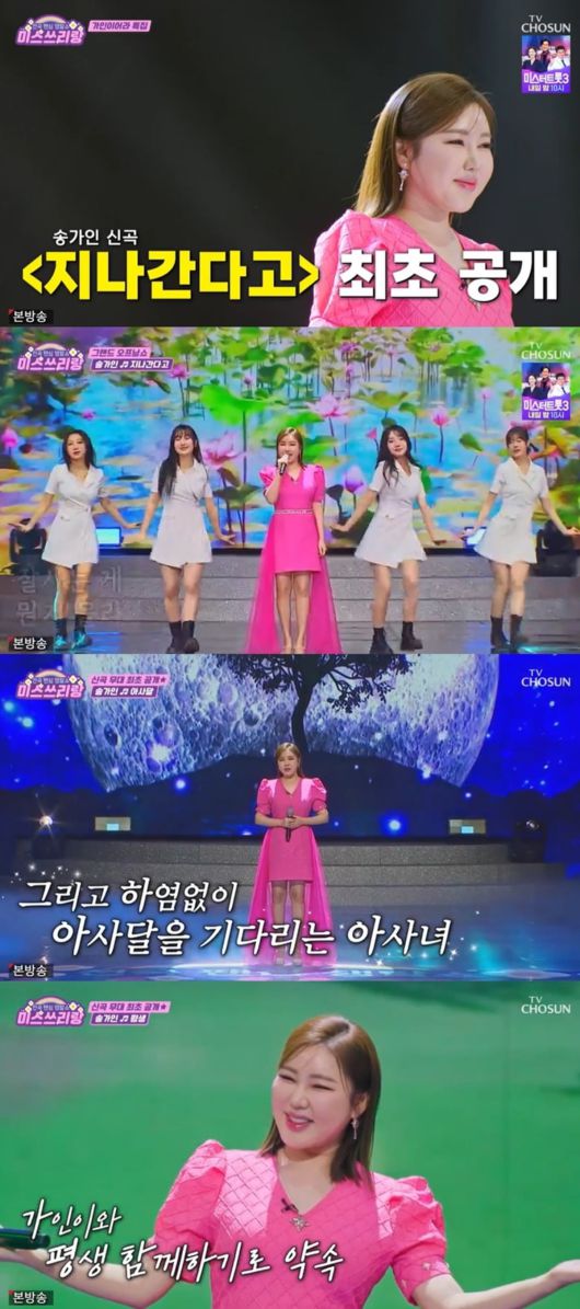 가수 송가인이 '미스쓰리랑'에서 신곡 무대를 방송 최초로 공개했다.