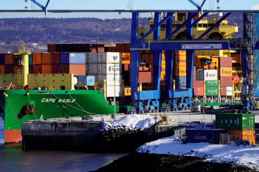 12일 캐나다 뉴브런즈윅주 세인트존에서 하팍로이드 컨테이너가 케이프 세이블 호에 적재되고 있다. 세인트존/로이터 연합뉴스 |