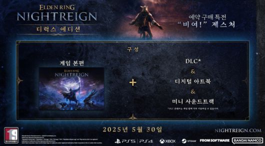 반다이남코 엔터테인먼트 코리아는 PlayStation®5, PlayStation®4, Xbox Series X|S, Xbox One, Steam®용 스탠드 얼론 어드벤처 협력 액션 서바이벌 ‘ELDEN RING 밤의 통치자’를 2025년 5월 30일(금) 발매한다고 발표했다.