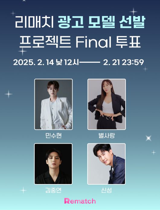 [스타데일리뉴스=황규준 기자] 리매치 광고 모델 선발 프로젝트의 2차 투표가 2월 2일 낮 12시부터 시작돼 2월 12일 23시 59분에 종료됐다. 1차 투표에서 살아남은 8명의 가수들이 치열한 경합을 벌였으며, 그중 최종 4명이 Final 매치에 진출했다.