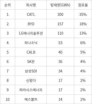 CATL, BYD, LG에너지솔루션, 파나소닉, CALB 등 상위 5개 업체가 전체 배터리 사용량의 76%를 차지한 것으로 나타났다.