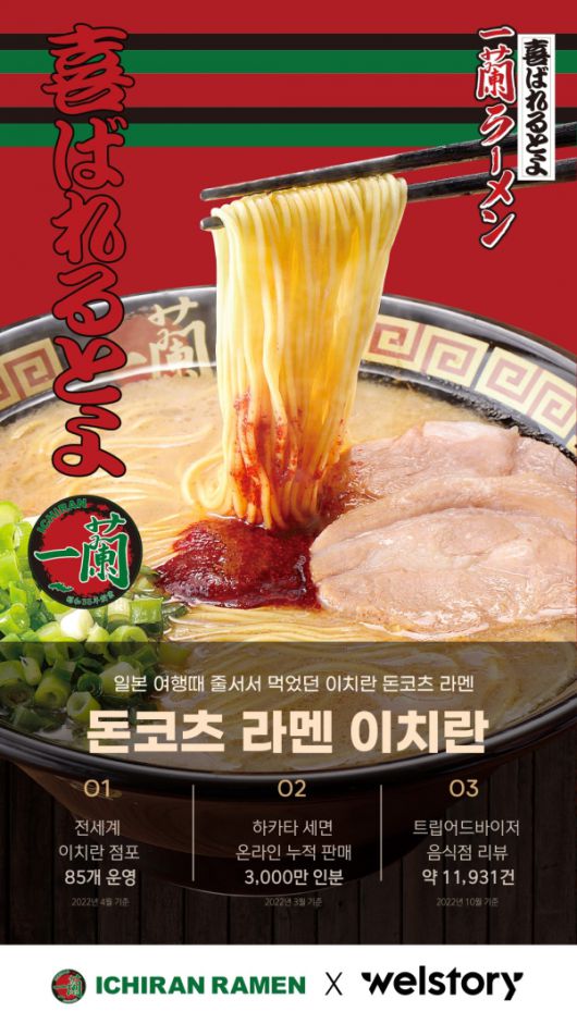 이치란 라멘은 삼성웰스토리가 첫 번째 테마 국가로 선정한 일본의 인기 라멘 맛집으로, 잡내를 완벽하게 제거한 돼지뼈 육수와 30여 가지 재료가 들어간 특제소스로 유명하다.