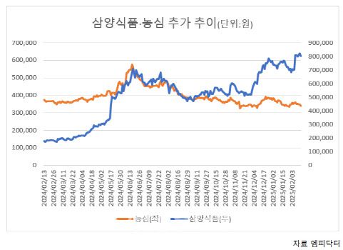 [이데일리 박정수 기자] 국내 주요 라면주 주가 희비가 갈리고 있다. 삼양식품(003230)은 ‘불닭볶음면’ 수출 호조로 사상 최대 실적을 경신하는 반면 농심(004370)은 ‘신라면 툼바’ 글로벌 런칭에도 전반적인 비용 부담에 발목이 잡혀 기대치를 밑도는 실적을 내놨다.