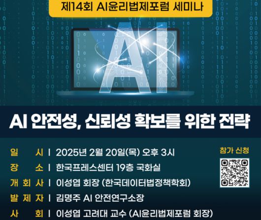 한국데이터법정책학회(회장 이성엽 고려대 교수)는 20일 한국프레스센터에서 ‘AI 안전성 및 신뢰성 확보를 위한 전략’이라는 주제로 ‘제14회 AI 윤리법제포럼’을 개최한다.