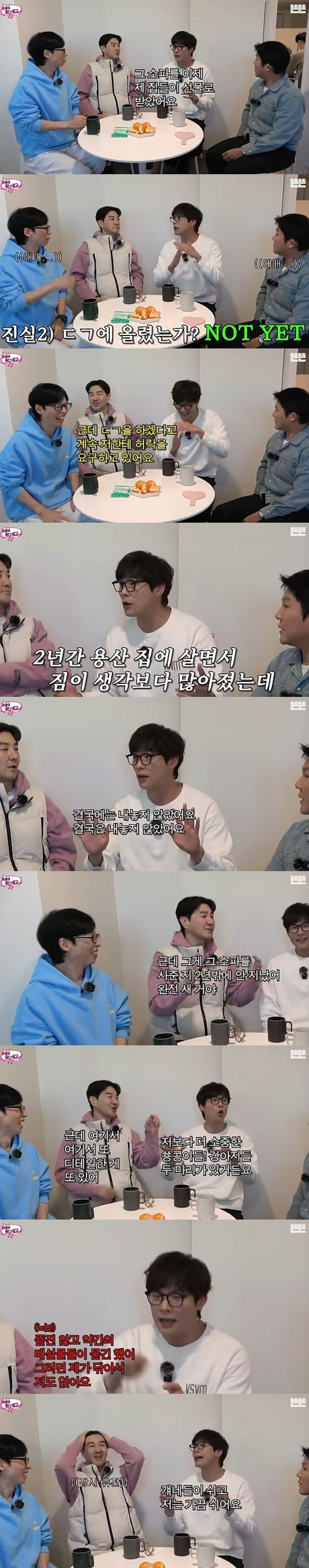 한상진은 "얘네 집에 갔는데 그 소파를 사준 지 2년밖에 안 됐다. 완전 새 거다. 소파가 안 보이더라"라며 황당해했다. 최다니엘은 "베란다에 있다. 나보다 더 소중한 강아지 두 마리가 쉬고 있다"라며 수습했다.