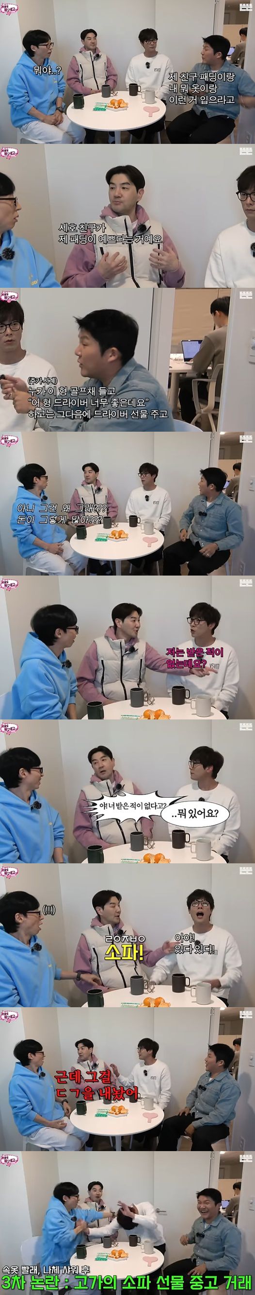 최다니엘은 "난 받은 적이 없다"라고 이야기했다. 한상진은 "야 너 받은 적 없다고? 레이지보이 소파. 근데 그걸 당근으로 내놨어"라며 발끈했다.