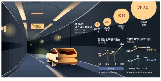 종합건설사의 일감을 받아 창호·도장·조경 등 세부작업을 처리하는 전문공사업체의 폐업 건수도 3000건(3034건)을 넘어섰다. 2022년(2525건)과 2023년(2987건) 대비 늘어난 수치다. 자금난에 허덕이다 부도를 낸 건설업체 역시 2022년 14곳, 2023년 21곳, 2024년 27곳으로 꾸준히 증가하고 있다.