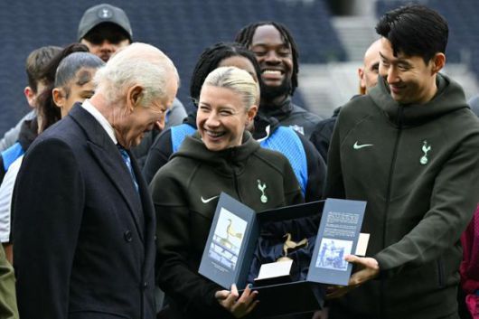 찰스 3세 영국 국왕이 12일 잉글랜드 프로축구 프리미어리그(EPL) 토트넘과 미국프로풋볼(NFL)이 후원하는 지역 아동 지원 프로젝트 격려차 런던의 토트넘 홋스퍼 스타디움을 방문해 토트넘 남자팀 주장 손흥민, 여자팀 주장 베서니 잉글랜드에게 토트넘을 상징하는 닭 로고 모형을 선물받으며 활짝 웃고 있다. 런던=AFP 연합뉴스 |