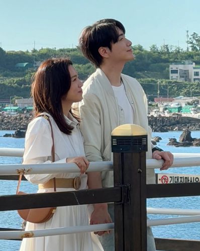 잔잔한 바람에 한지민의 흰 원피스가 살짝 흔들리고, 이준혁의 옅은 미소가 햇살과 어우러져 부드러운 분위기를 자아낸다.