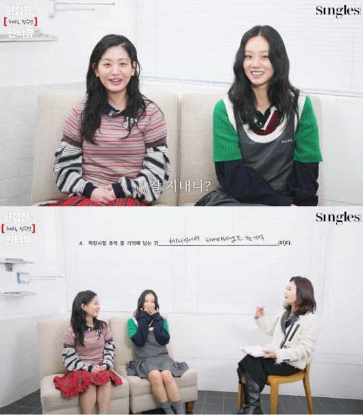 영상 속 두 사람은 ‘싱글즈’ 편집장이 준비한 질문에 답변하며 ‘선의의 경쟁’ 촬영 비하인드 스토리를 전했다. 먼저 학창 시절 추억 중 기억에 남는 게 있는지 물었다. 혜리는 ‘댄스 동아리’라고 적었고, 정수빈은 “걸스데이의 ‘썸씽(Something)’을 춘 기억”이라고 말했다.
