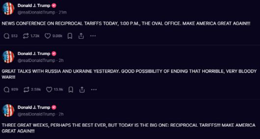 트럼프 대통령은 이날 자신의 소셜미디어인 트루스소셜에 “지난 3주간은 역대 최고였지만, 오늘이 중요한 날이다. 상호관세! 미국을 다시 위대하게”라면서 “상호 관세 발표는 오늘 오후 1시 대통령 집무실에서 하겠다”고 밝혔다.