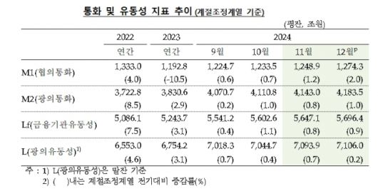한국은행이 13일 발표한 '2024년 12월 통화 및 유동성' 통계에 따르면 지난해 12월 시중통화량은 M2(광의통화·평잔) 기준 4183조5000억원으로 전월 대비 40조5000억원(1%) 늘었다.